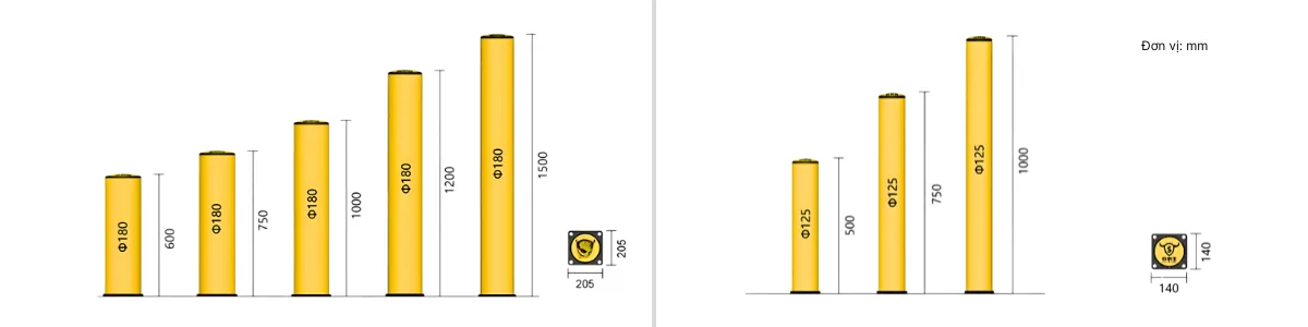 LEVELER cung cấp nhiều mẫu trụ chống va đập với kích thước tiêu chuẩn khác nhau. Mỗi loại được thiết kế phù hợp cho từng ứng dụng cụ thể, từ kho xưởng đến giao thông công cộng.